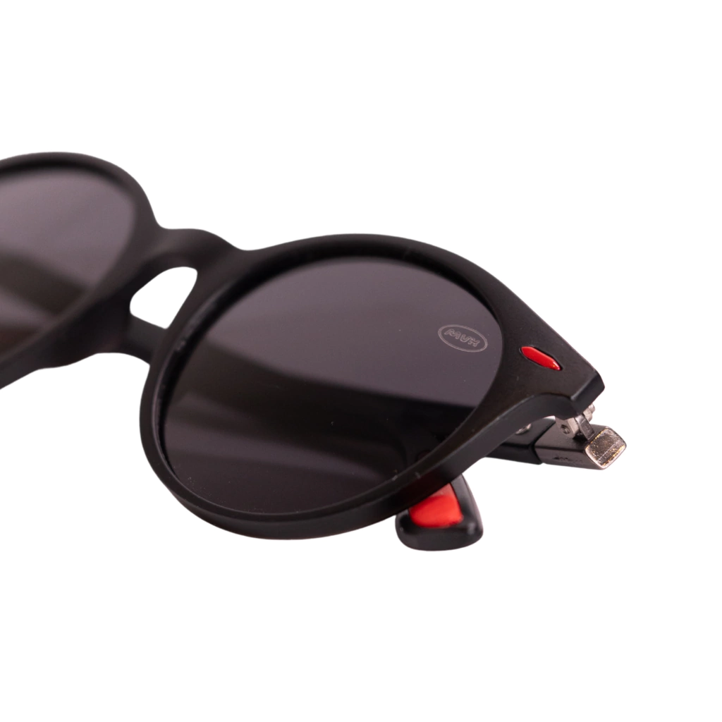 Óculos solar esportivo unissex com lente preta, haste preta e detalhes em vermelho.