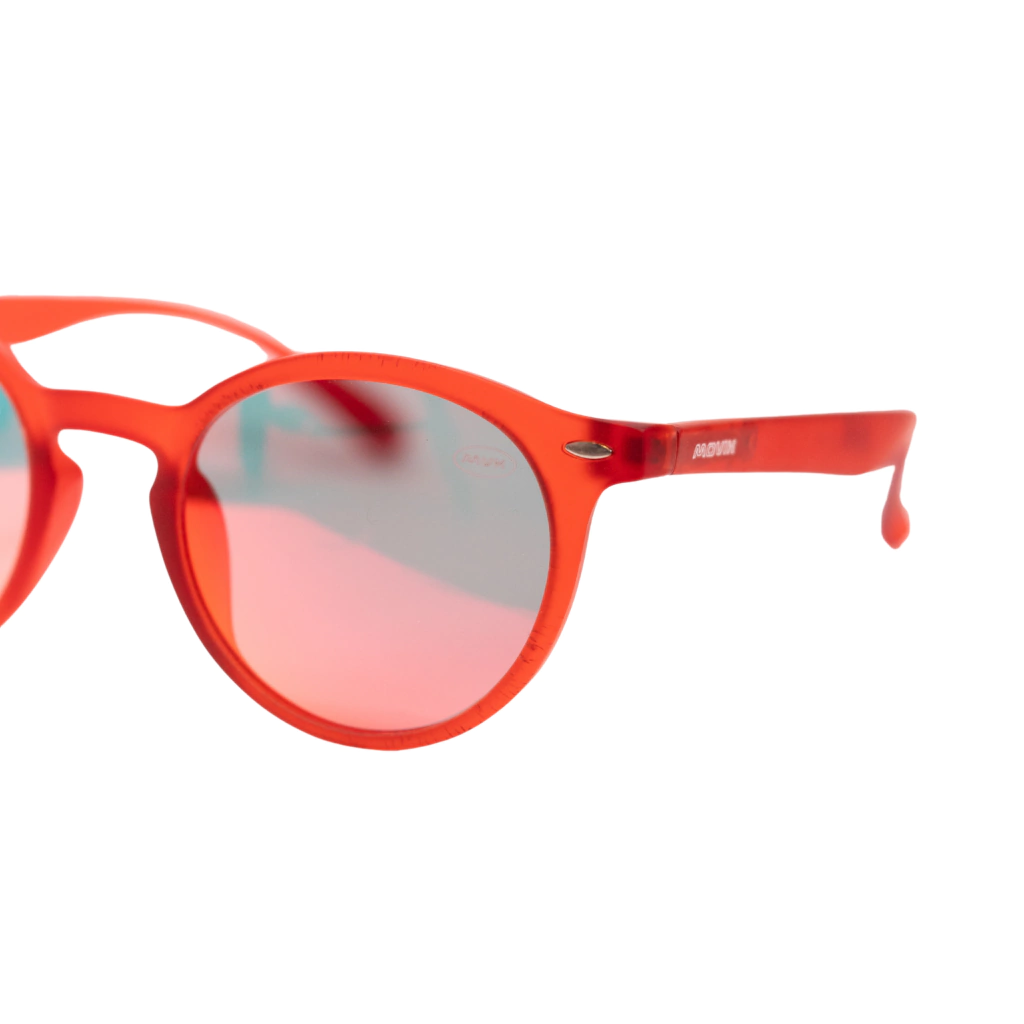 Óculos solar esportivo com lente espelhada vermelha e haste vermelha.